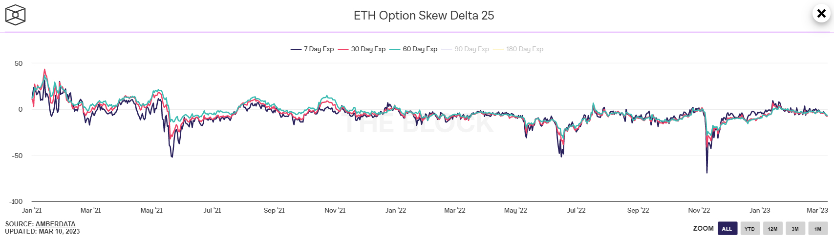 The 25% delta skew of Ether choices expiring in 7, 30 and 60 days have every fallen to new two-month lows within the -7 space.