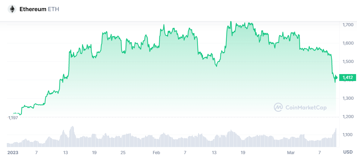 The ETH worth cratered from the mid-$1,500s on Thursday amid a mixture of considerations regarding the collapse of crypto-friendly Silvergate Bank and a rising liquidity disaster at fellow crypto-friendly financial institution SVB Monetary.