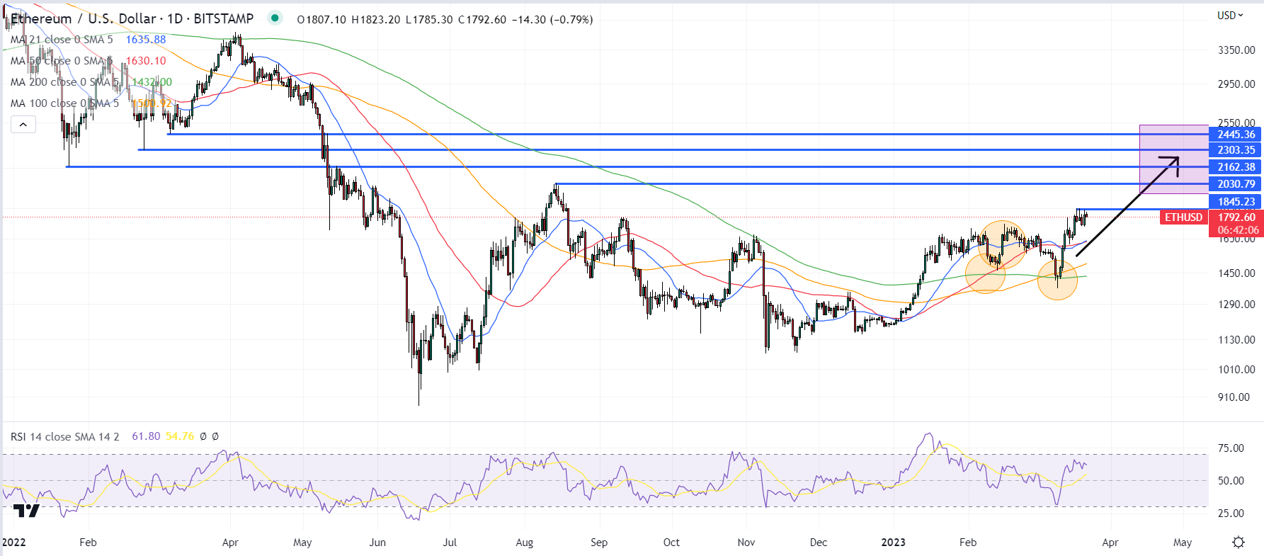 ETH/USD robust latest bounce from its 200-Day Shifting Common and up to date golden cross (ETH’s 50DMA moved above its 200DMA in early February) are each long-term bullish technical indicators.