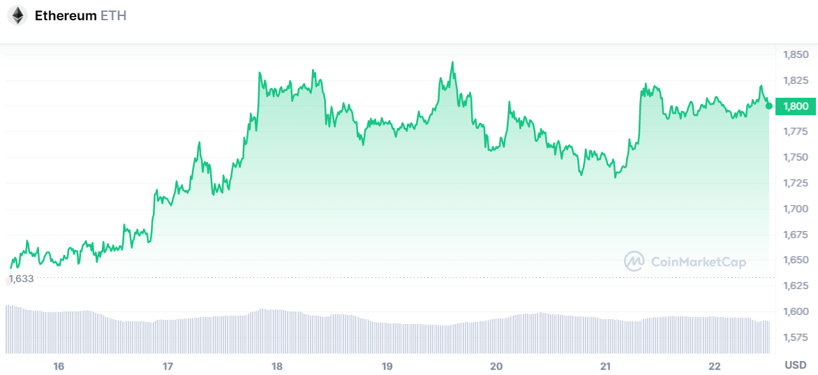 Ether was final altering palms simply above $1,800, having seen an honest bounce from earlier weekly lows within the $1,720s on Tuesday.