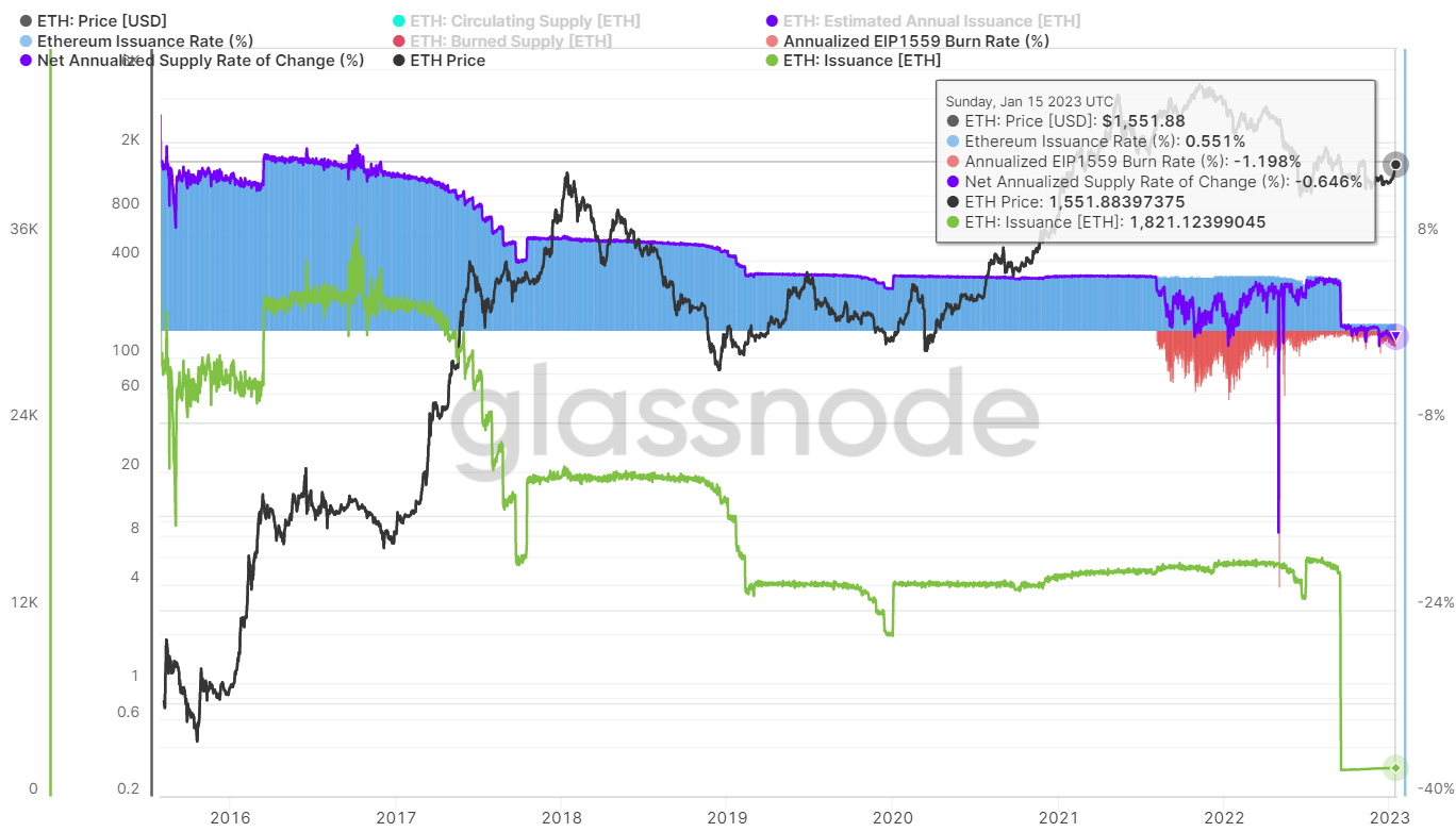 Certainly, as of Sunday the 15th of January, Ethereum’s annual issuance fee was round 0.55%, whereas its burn fee was just below 1.2%. Because of this, Ethereum is presently experiencing deflation at a fee of round 0.65% per 12 months. Again when Ethereum was nonetheless a proof-of-work blockchain, its inflation fee was 4-5%.