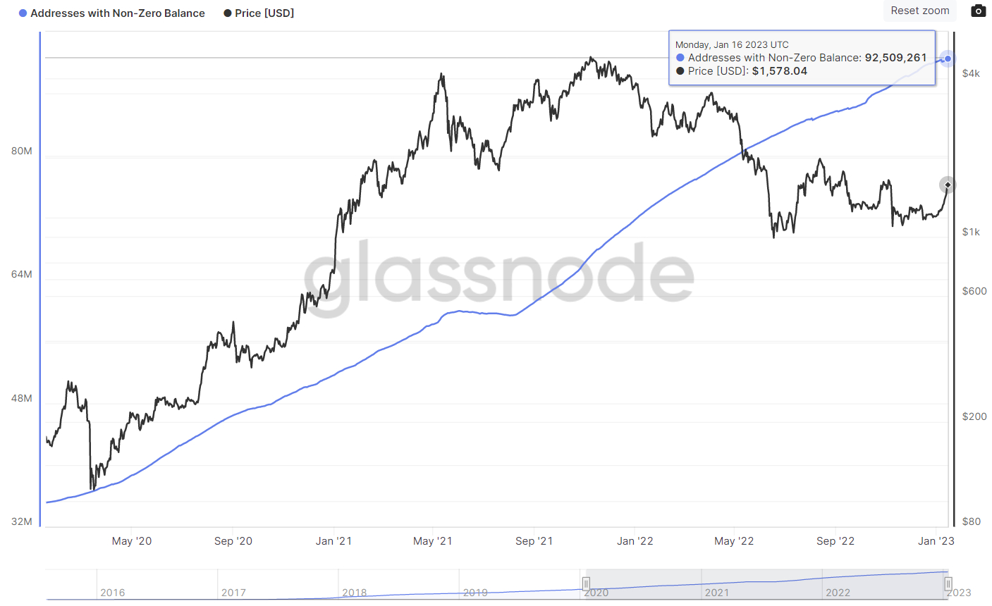 The variety of Ethereum addresses holding a non-zero steadiness hit a brand new document excessive on Monday of 92.5 million. 2022’s bear market, which culminated within the collapse of one of many world’s former largest cryptocurrency exchanges in November, doesn’t seem to have impacted progress within the variety of non-zero steadiness addresses.