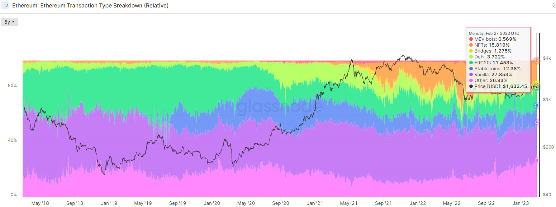 One of many massive areas of weak point versus this time two years in the past is exercise in Decentralized Finance (DeFi) associated transactions. In early March 2021, DeFi transactions made up round 12% of all Ethereum transactions. As of late February 2023, they make up solely round 4%.