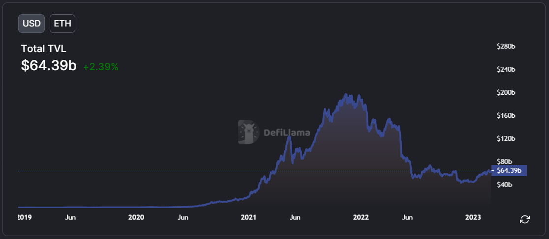 That decline isn’t so stunning within the context of the large decline within the Ethereum DeFi ecosystem’s whole worth locked (TVL) in sensible contracts. In keeping with DeFi Llama, Ethereum TVL was final round $64.4 billion, down over 65% from its late 2021 report highs of above $197 billion. An enormous chunk of that decline occurred in tandem with the collapse of the Terra DeFi ecosystem when Terra’s UST algorithmic stablecoin collapsed, delivering a big blow to confidence within the sector.