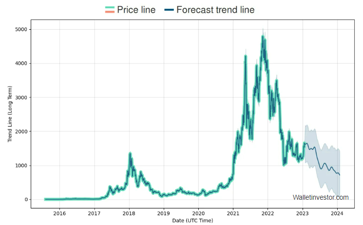 In keeping with algorithm-powered crypto forecast web site Wallet Investor, Ethereum is prone to commerce simply above $700 in a single yr’s time, round 55% decrease versus present ranges.