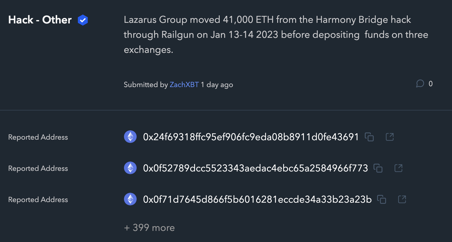 In a follow-up tweet, ZachXBT additionally linked to the web site Chainabuse.com the place he shared a full record of the roughly 400 Ethereum addresses he claims the place concerned within the operation.