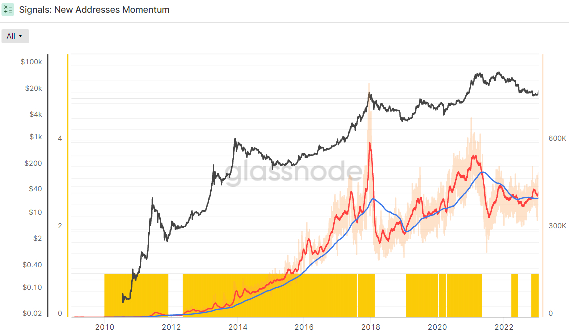 Momentum in new addresses additionally not too long ago took a flip for the higher, with the 30-day easy transferring common (SMA) not too long ago leaping above the 200-day SMA, a shift which regularly happens at the beginning of a Bitcoin bull market.